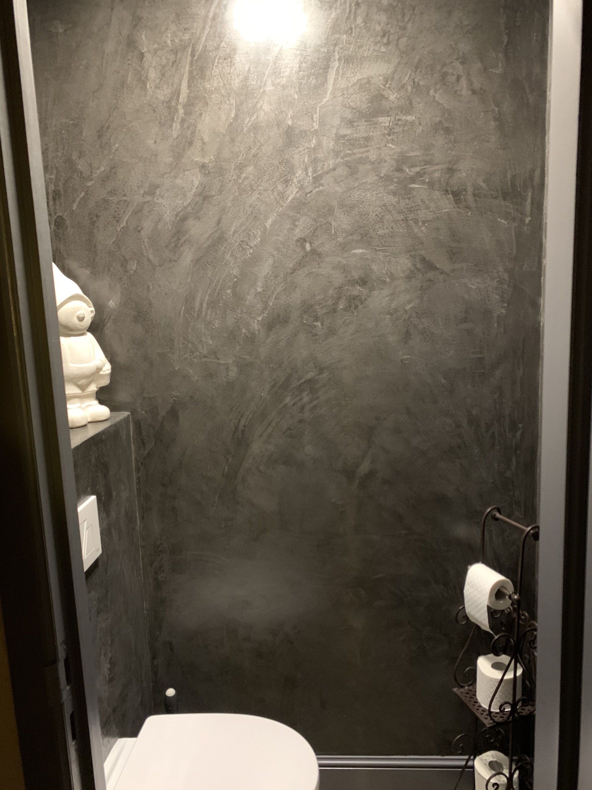 Door het combineren van verschillende contrasten kan men een zéér mooi eindresultaat bekomen. Een zwarte Mortex in combinatie met zwarte tegels, wit toilet, witte plint en wit plafond.